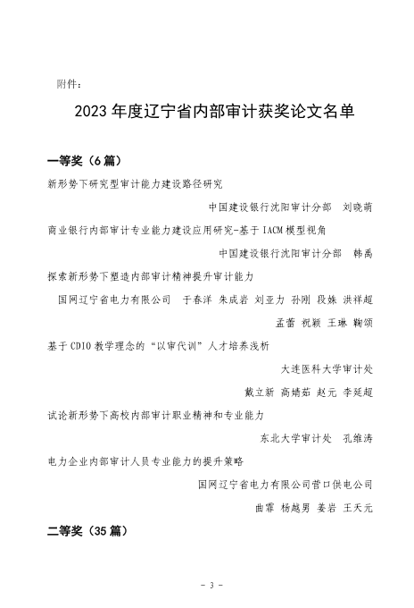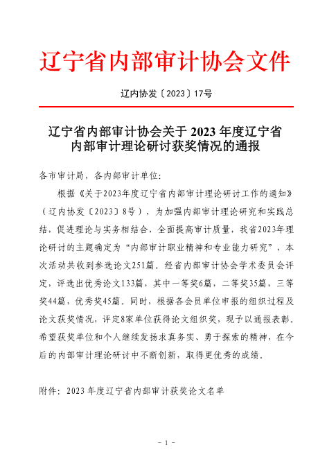 为加强内部审计理论研究和实践总结,促进理论与实务相结合,全面提高审计质量,辽宁省内部审计协会以“内部审计职业精神和专业能力研究”为主题,面向省内各行各业内部审计机构和审计人员组织开展理论研讨活动。本次活动共收到参选论文251篇,经省内部审计协会学术委员会评定,评选出优秀论文133篇,其中一等奖6篇,二等奖35篇,三等奖44篇,优秀奖45篇。我校审计处参选的《基于CDIO教学理念的“以审代训”人才培养浅析》一文荣获优秀论文一等奖。